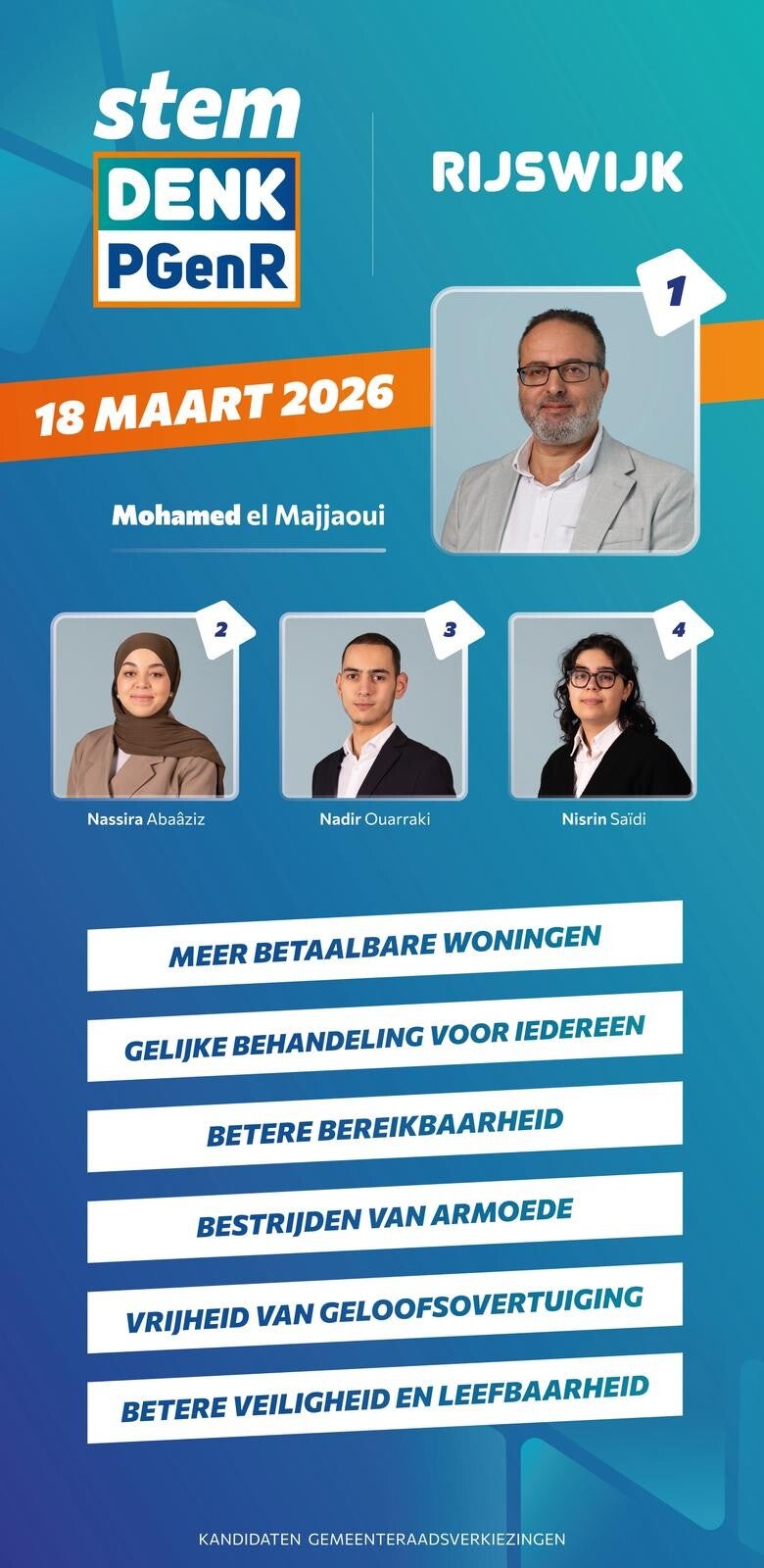 Elke kandidaat op onze lijst is gekozen op basis van hun toewijding aan onze kernwaarden: een eerlijker, socialer en inclusiever Rijswijk. Ze brengen diverse achtergronden en expertise mee, verenigd in de overtuiging dat Rijswijk beter verdient. Samen bouwen we aan een stad waar iedereen meetelt. Voor rechtvaardigheid. Voor gelijkheid. Voor Rijswijk. Ontdek hun verhalen, motivaties en wat zij voor u willen betekenen. Jouw stem maakt het verschil – Gaan stemmen op Denk-PGenR!